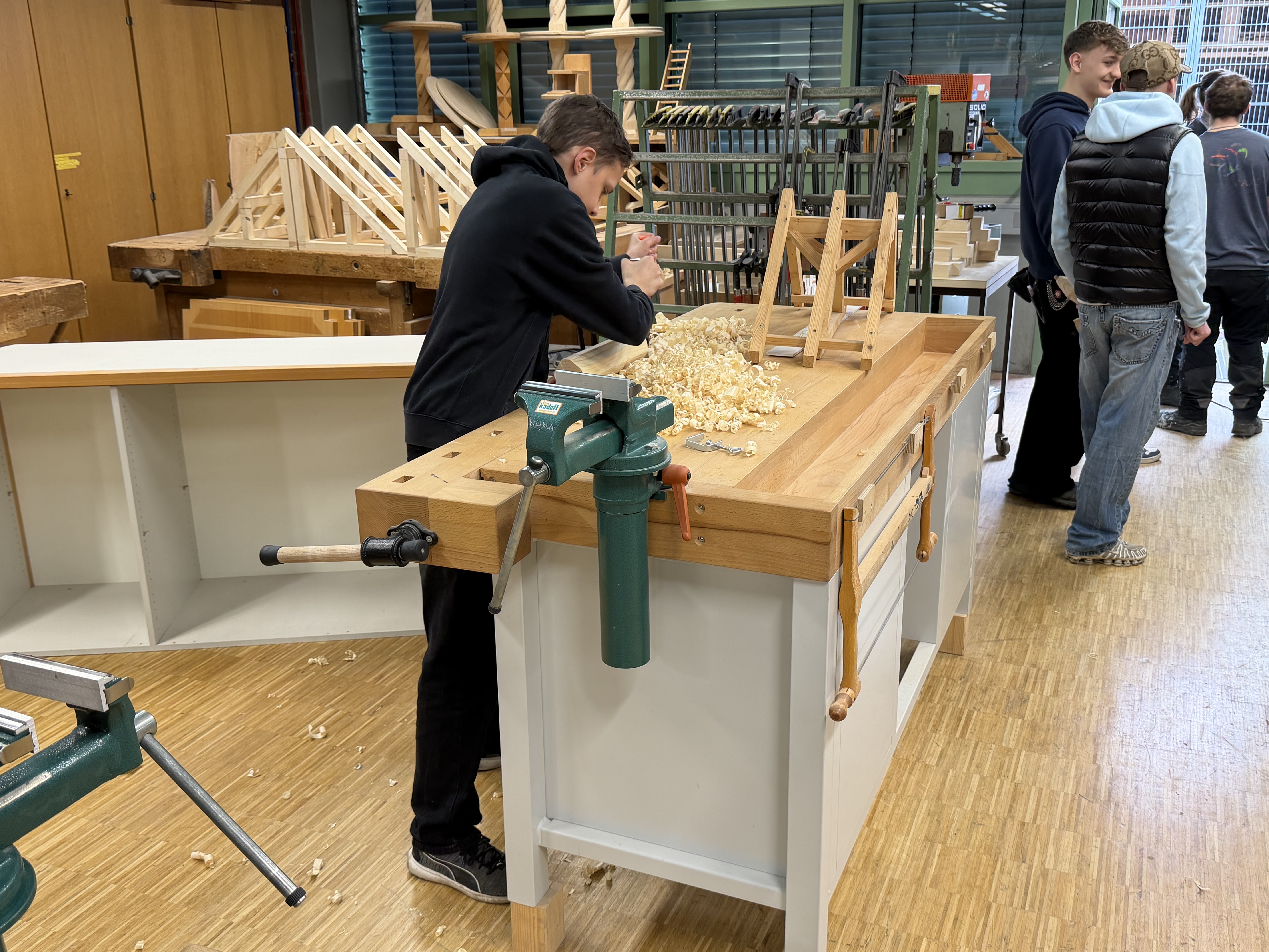 Nach rund zwei Stunden intensiver Praxis stand eine wohlverdiente Pause auf dem Programm. Bei Vesper und Getränken wurde lebhaft diskutiert: Wer hatte das spannendste Werkstück gebaut? Welcher Beruf überraschte am meisten? Die Begeisterung war deutlich spürbar.