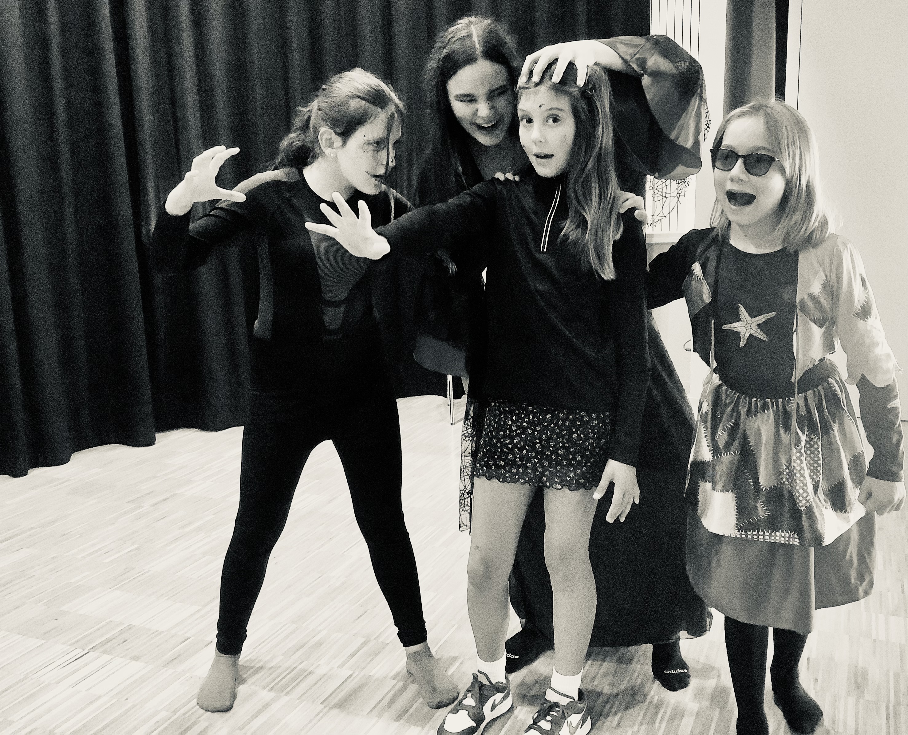 Am Mittwoch, 26.10.22, wurde es in der Mensa auf der Bühne des BZM gruselig. Wir, die Teilnehmer der Theater-AG, verwandelten uns in Zombies, Hexen, Vampire, Geister und sonstige schauerhafte Gestalten. Auch der Boden verwandelte sich auf zauberhafte Art und Weise in Matsch und Glibber, ließ Tote auferstehen und Spinnen krabbeln. Zombies tanzten zu Michael Jacksons „Thriller“ oder sie verfolgten zwei nichts ahnende Spaziergänger und jagten ihnen Angst und Schrecken ein. Geübt wurde auch das plötzliche Stehenbleiben – in der Theatersprache auch „Freeze“ genannt. Zudem haben wir gruselige Halloweengeschichten erfunden und vorgespielt.