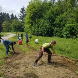 Auf Grund des kalten und nassen Wetters hat sich der Termin für die Aussaat lange hingezogen und die Natur AG musste mit großem Arbeitseinsatz den Boden nochmals von Hand bearbeiten, um das nachgewachsene Gras wieder zu entfernen. Gemeinsam wurde diese Arbeit mit Humor und Engagement bewältigt, sodass die Aussaat nun endlich stattfinden konnte.
