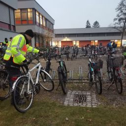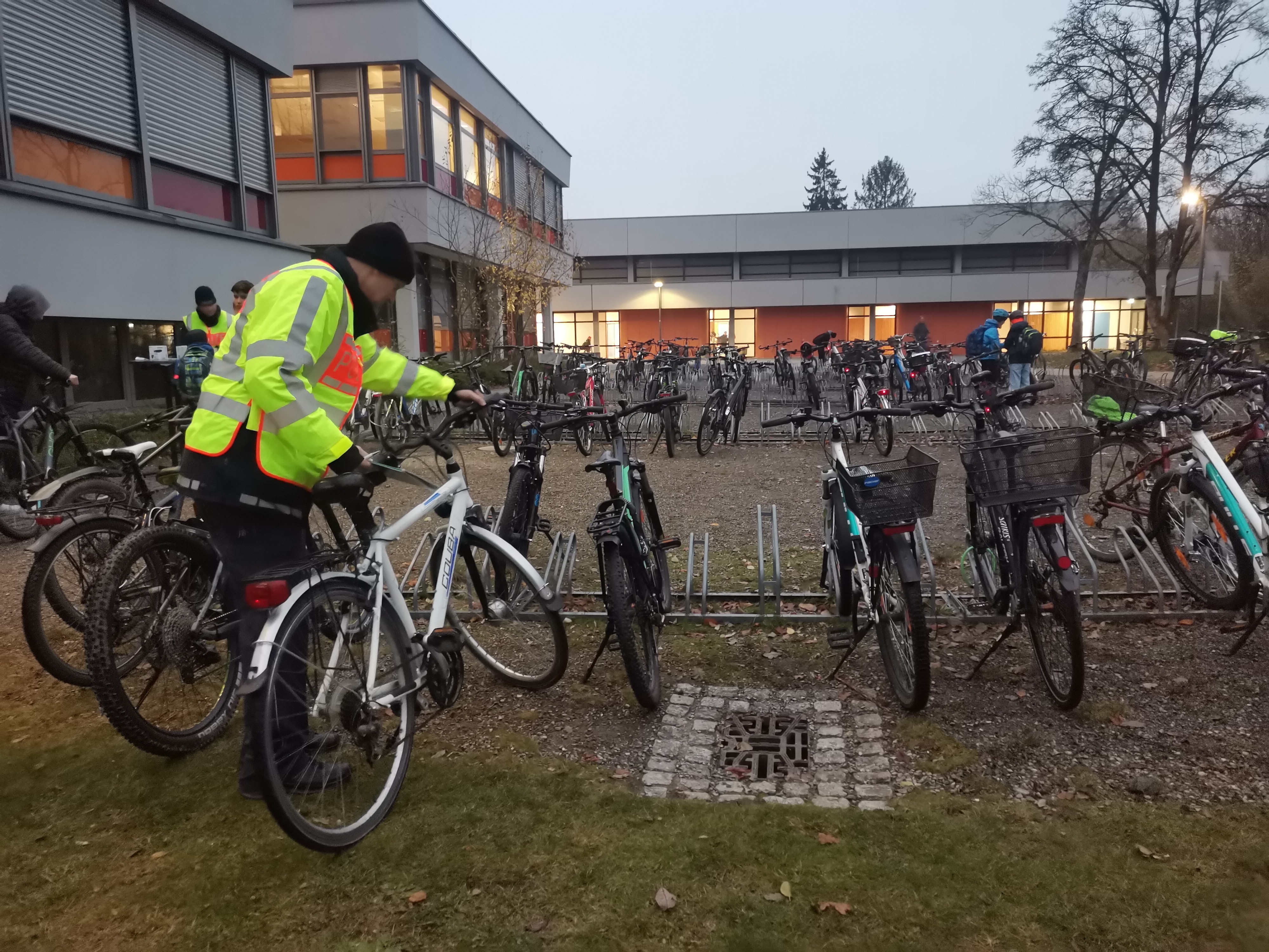 Bereits ab 6.45 Uhr wurde alles für die Kontrolle zur Verkehrssicherheit am Fahrradständer des BZM vorbereitet. Unter dem Motto „gesehen werden“, wurden die Fahrräder der heranfahrenden SchülerInnen begutachtet und die Verkehrssicherheit bewertet. Licht, Reflektoren, Klingel und auch gut eingestellte Bremsen sollten am Fahrrad vorhanden und voll funktionsfähig sein. Bei wem dies nicht zutraf, sollte baldmöglichst die Mängel beseitigt werden. Hierfür bekamen die Betroffenen ein vom Landratsamt gespondertes Vorder- oder Rücklicht geschenkt, damit die Verkehrssicherheit in Zukunft gegeben ist.