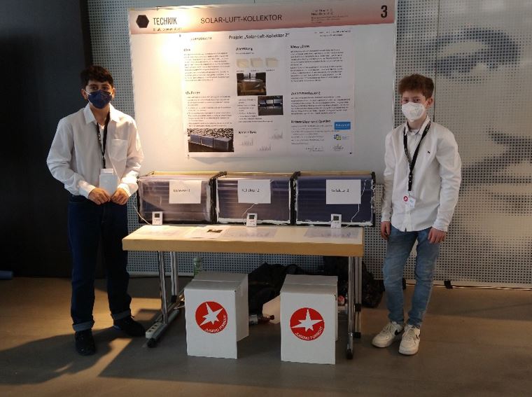 Der von den beiden entwickelte Solar-Luftkollektor erwärmt mit Hilfe von Sonnenenergie die darin enthaltene Frischluft, welche dazu genutzt wird, das Auskühlen der Klassenräume beim Lüften zu verhindern. Gerade in der Coronapandemie hat sich gezeigt, dass ausreichend gelüftete Räume Infektionen minimieren können. Damit die Schüler nicht unnötig frieren und die Heizungen der Räume übermäßig hoch eingestellt werden müssen, liefern diese Solar-Luftkollektoren einen entscheidenden Beitrag, um die Kosten für den Schulträger im Rahmen zu halten und den allgemeinen CO2-Ausstoß zu minimieren. Dieses Potenzial erkannten auch die Juroren des Wettbewerbs und honorierten das Projekt mit dem Sonderpreis „Energiewende“ vom Bundesministerium für Wirtschaft und Klimaschutz. Die Betreuerin Frau Sauter ist mächtig stolz auf ihre Jungs und würde sich freuen, wenn die beiden das Projekt über den Prototyp hinaus weiterentwickeln würden.