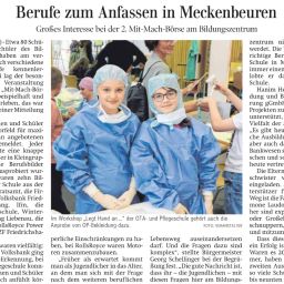 Ausbildungs- und Studienplatzsuche gestaltet sich nicht immer leicht. Hunderte von beruflichen Möglichkeiten und Wege stehen zur Verfügung. Hier möchte das Veranstaltungsformat „Mit-Mach-Messe-Meckenbeuren“ eine Antwort geben. SCHULEWIRTSCHAFT Baden-Württemberg, der Bildungsträger BBQ Bildung und Berufliche Qualifizierung gGmbH sowie das Bildungszentrum Meckenbeuren gehen zusammen neue Wege. Am 10. Mai fand im Schulzentrum die „2. Mit-Mach-Messe“ statt. Zusammen mit Ausbildern und Personalverantwortlichen gaben die Veranstalter Auskunft über die aktuellen Berufe und deren Anforderungen aus der Region Meckenbeuren.