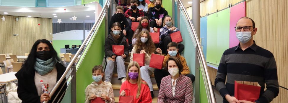 13.12.2021 – Am Donnerstag überbrachte Bürgermeisterin Elisabeth Kugel den Schülerinnen und Schülern aus den Klassen 7a und 7b des Bildungszentrums (BZM) eine Adventsüberraschung. Anlass war die Aktion „Mitmachen Ehrensache“, an der die Jugendlichen am 2. Dezember teilgenommen hatten. „Ich finde es toll, dass ihr die Chance genutzt habt“, lobte die Bürgermeisterin. „Ihr konntet so praktische Erfahrung in Unternehmen bei uns vor Ort sammeln und euch gleichzeitig für einen sozialen Zweck engagieren. Danke für euren Arbeitseinsatz – wir brauchen eure Kraft und eure Ideen, um unsere Welt lebenswert zu gestalten.“