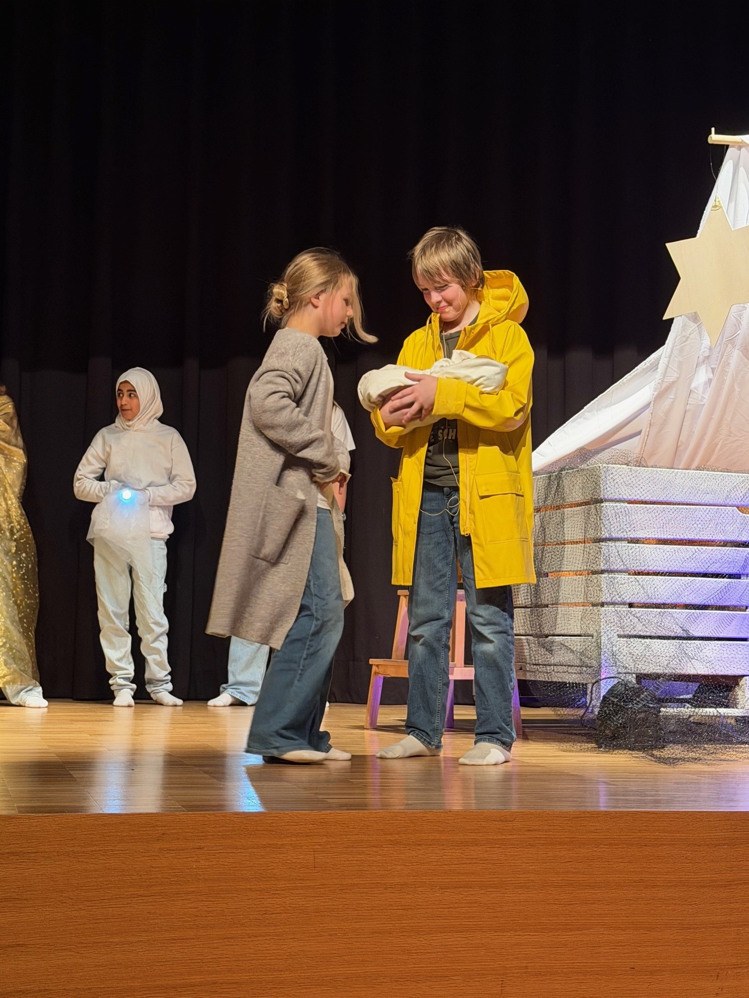 In der Aufführung ging es um einen Fischer, der mit seiner Frau am Meer lebte und täglich einen guten Fang machte. Die beiden waren sehr glücklich, weil sie bald ein Kind erwarteten. So merkten sie nicht, dass bald ein zäher Nebel aufzog und ihr Glück trübte. Nach langen Nebelwochen blieb dem Fischer nichts anderes übrig, als trotzdem aufs Meer zu fahren. Um seine Frau zu beruhigen, sägte er vor seiner Fahrt einen hölzernen Stern aus, den er an seinem Boot befestigte. Auf dem Meer setzte sich der Fischer einer großen Gefahr aus. Er trieb orientierungslos im Meer herum, als der Holzstern plötzlich zu leuchten begann und die Sterne des Himmels ihn nach Hause führten. Mit den ermutigenden Worten „Habe den Mut deinem eigenen Stern zu vertrauen. Setz dein Segel im Sturm und blicke nach vorn“ endet das Theaterstück hoffnungsfroh.