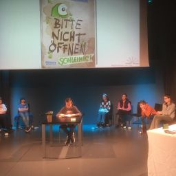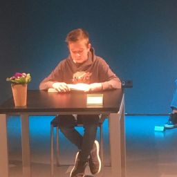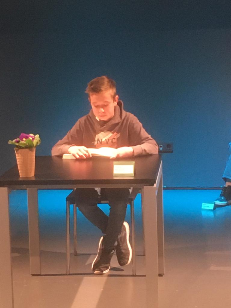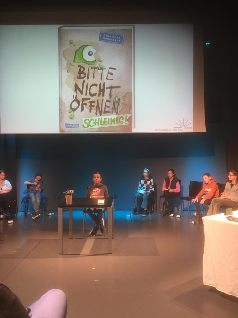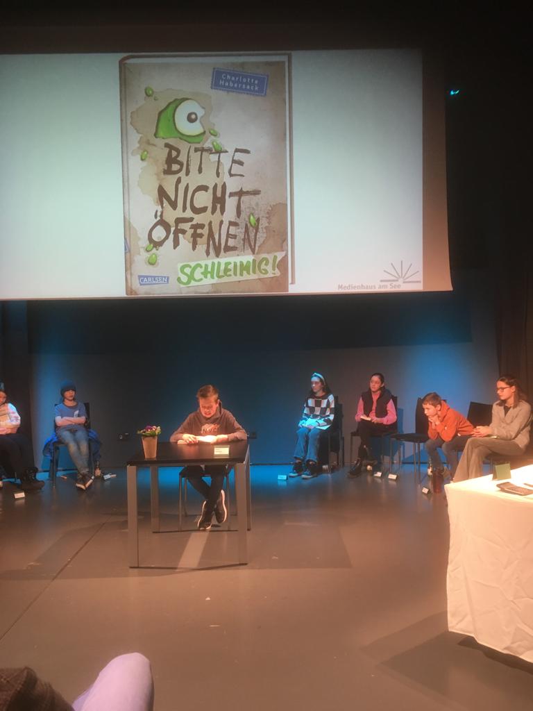 Mit seinem Buch "Gregs Tagebuch - Keine Panik" schaffte er es, die Jury mit seinem Vorlesetalent zu überzeugen. Am 7. Februar 2023 war es dann soweit: Der Kreisentscheid im Medienhaus am See in Friedrichshafen stand an. Top vorbereitet und mit einem von uns allen signiertem Buch "Bitte nicht öffnen- schleimig, von Charlotte Habersack", betrat er das Medienhaus. Sein bester Freund und seine Familie begleiteten ihn dabei. Alle zehn Kandidaten aus dem Bodenseekreis lasen was das Zeug hielt und ernteten dabei viel Applaus.